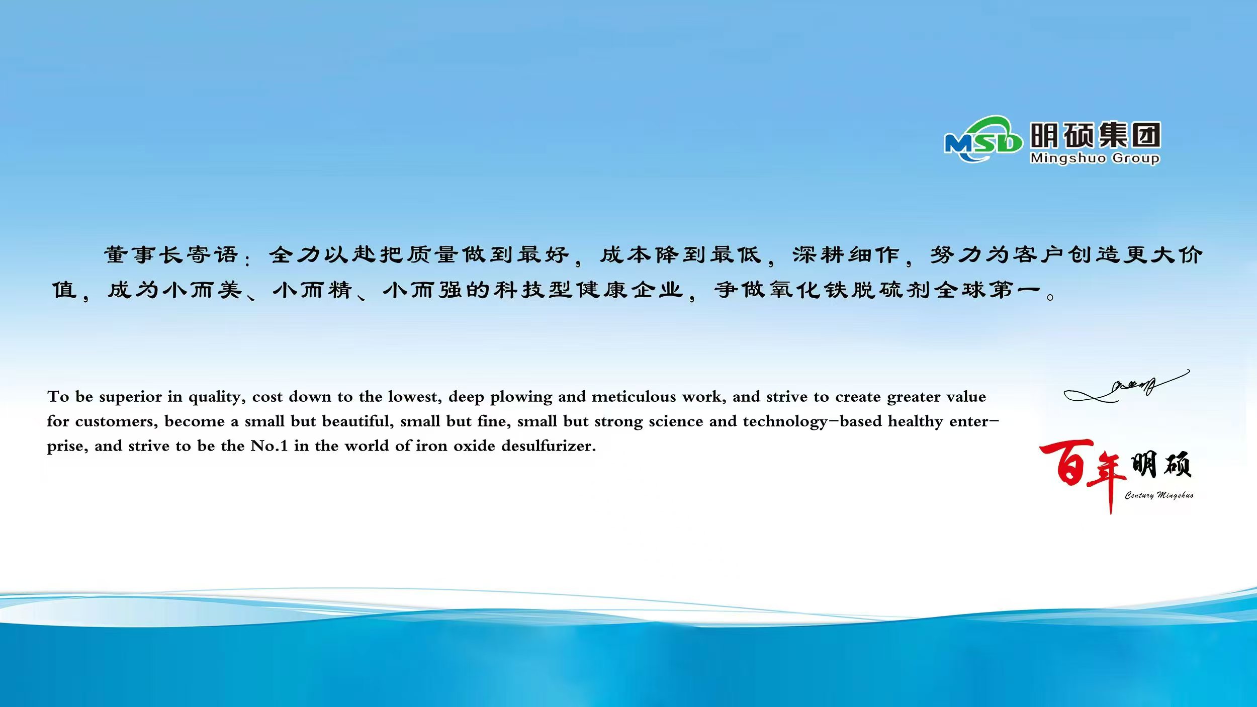 明硕产品分两大系列:脱硫药剂及脱硫装备,其中年产氧化铁系列脱硫剂20万吨。主要用于天然气、石油伴生气、煤层气、页岩高炉煤气、焦炉煤气、煤化工、沼气、石油炼化尾气等含硫气体的净化。明硕研发生产的羟基氧化铁脱硫剂,拥有多项自主发明专利,该系列脱硫剂具有脱硫精度高、反应速率快、使用周期长、运行成本低等特点,广泛应用于各行业含硫化氢气体的脱除。明硕研发的新式高效络合铁湿法脱硫装备,在正常工艺条件下脱硫效率达到99.99%,达到国际先进水平。 公司拥有自主进出口权,已为美国、加拿大、俄罗斯、德国、日本、中东及一带一路沿线国家逾千家客户提供了全套脱硫系统服务。